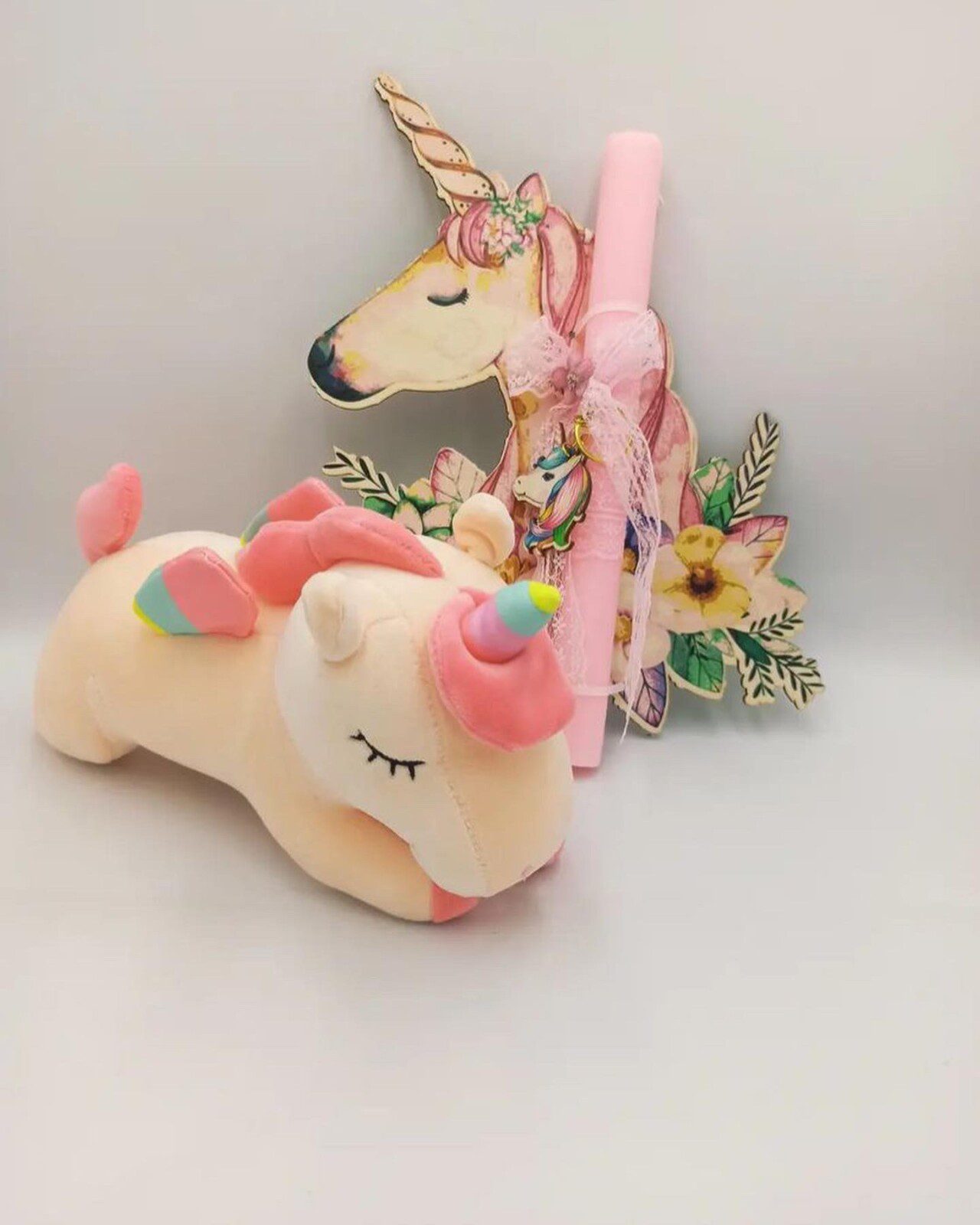 Λαμπάδα με μονόκερο λούτρινο , έγχρωμη ξύλινη διακοσμητική πλάτη και μπρελόκ πάνω στη λαμπάδα
