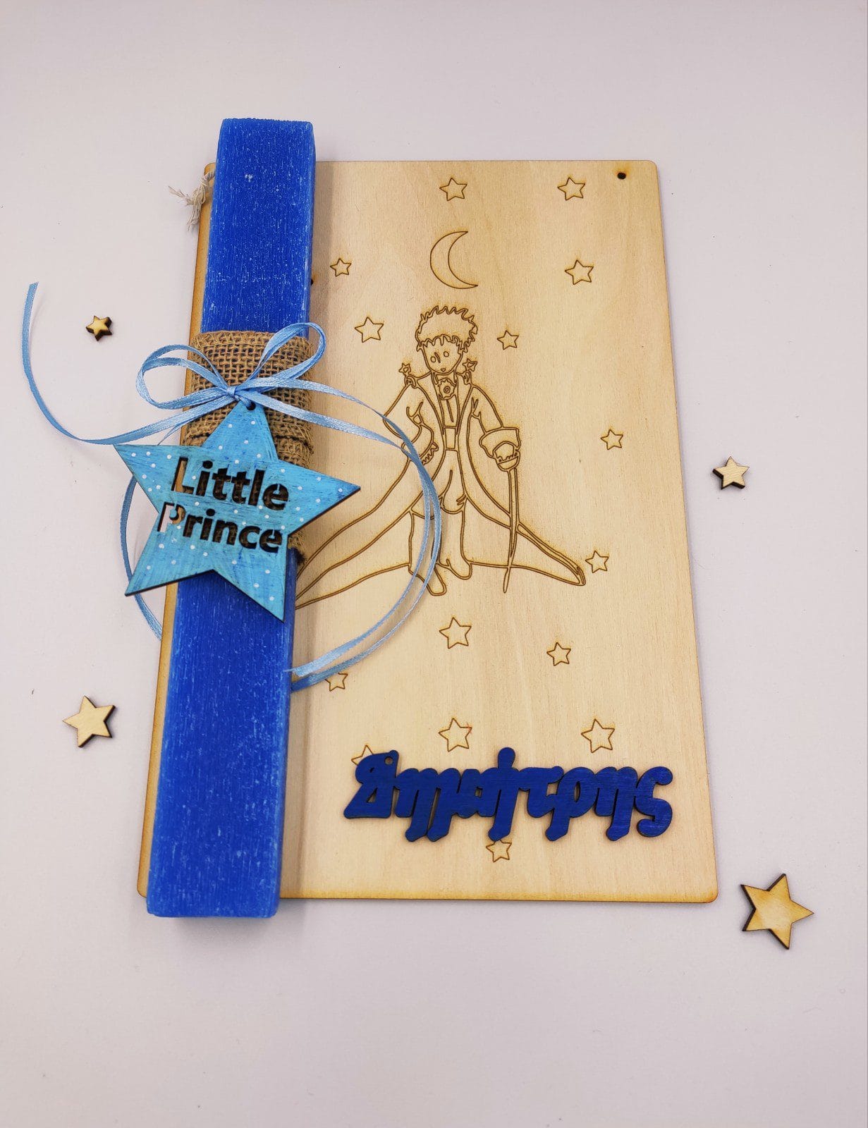 Λαμπάδα μικρός πρίγκιπας με ξύλινη διακοσμητική πλάτη και όνομα της επιλογής σας