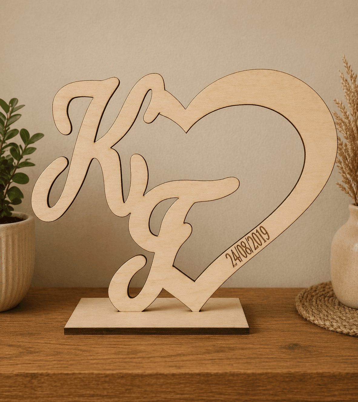 Ξύλινη καρδιά με βάση , τα αρχικά σας και ημερομηνία