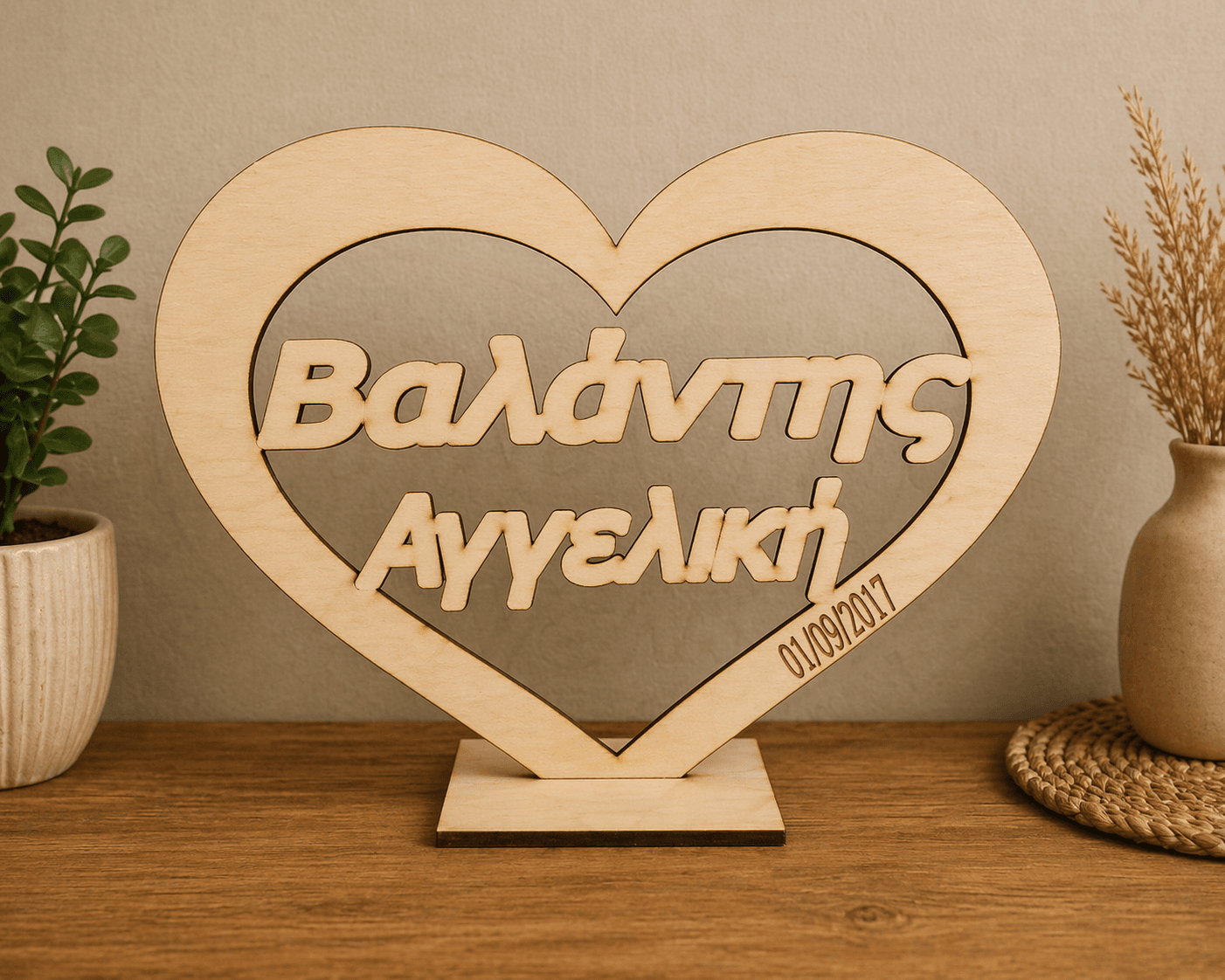 Ξύλινη καρδιά με ονόματα και βάση