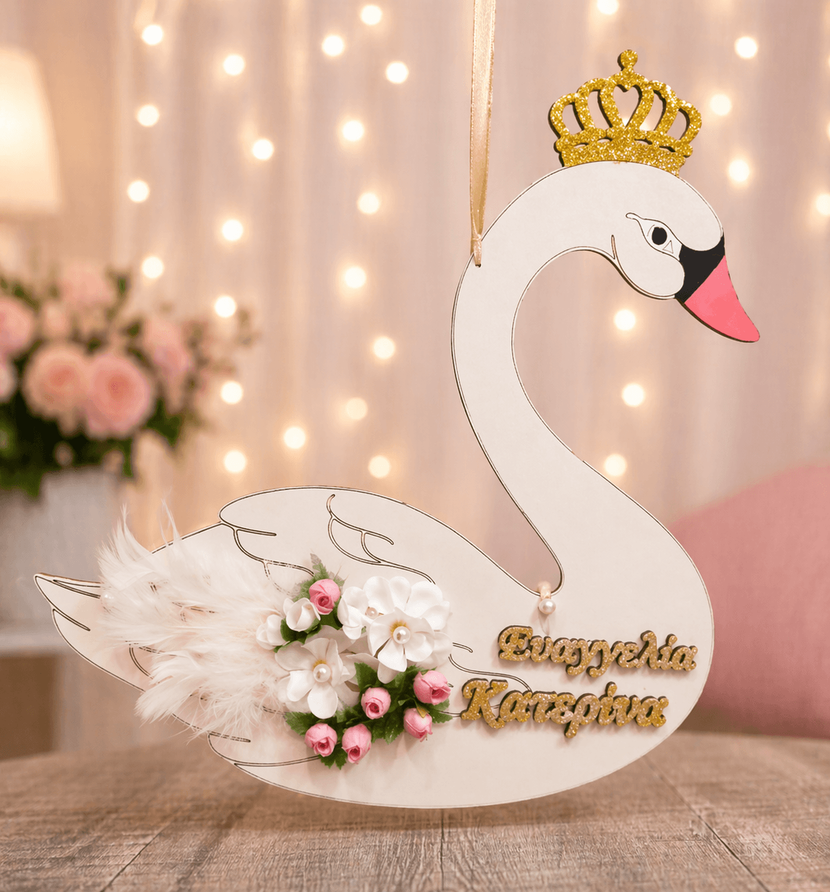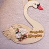 Ξύλινος διακοσμητικός κύκνος με όνομα, λουλούδια και πούπουλα