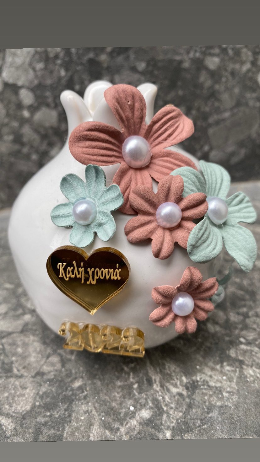 Ρόδι κεραμικό λευκό με λουλούδια και καρδιά χρυσή καλή χρονιά
