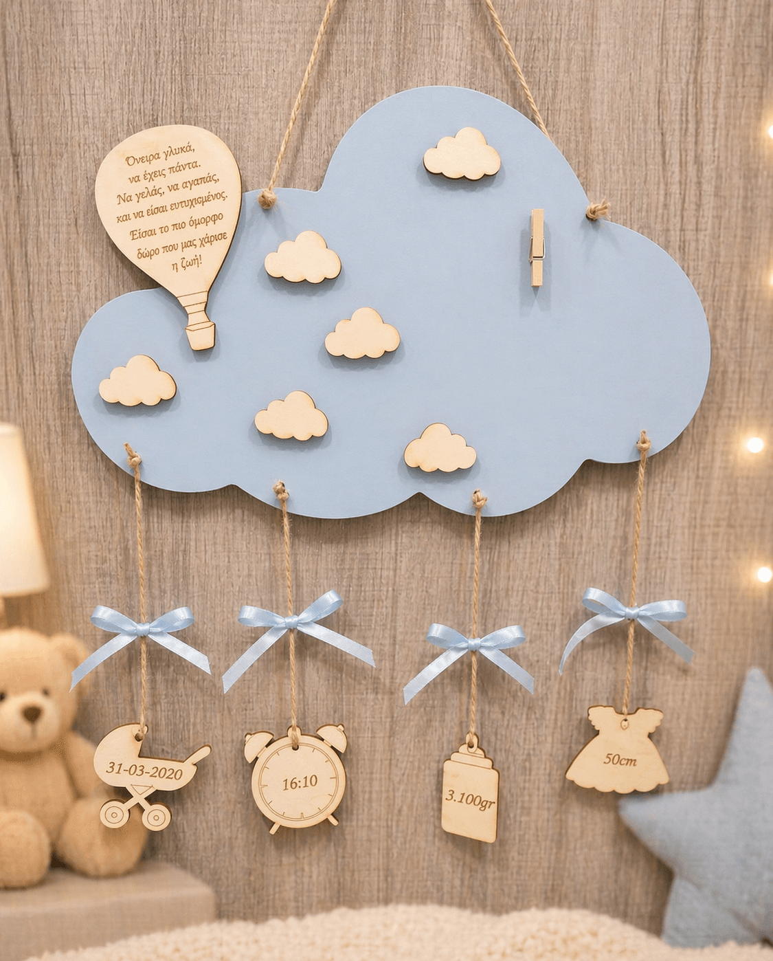 Σύννεφο κρεμαστό , με ευχή στο αερόστατο, συννεφάκια, στοιχεία γέννησης και ξύλινο μανταλάκι για να κρεμαστεί φωτογραφία